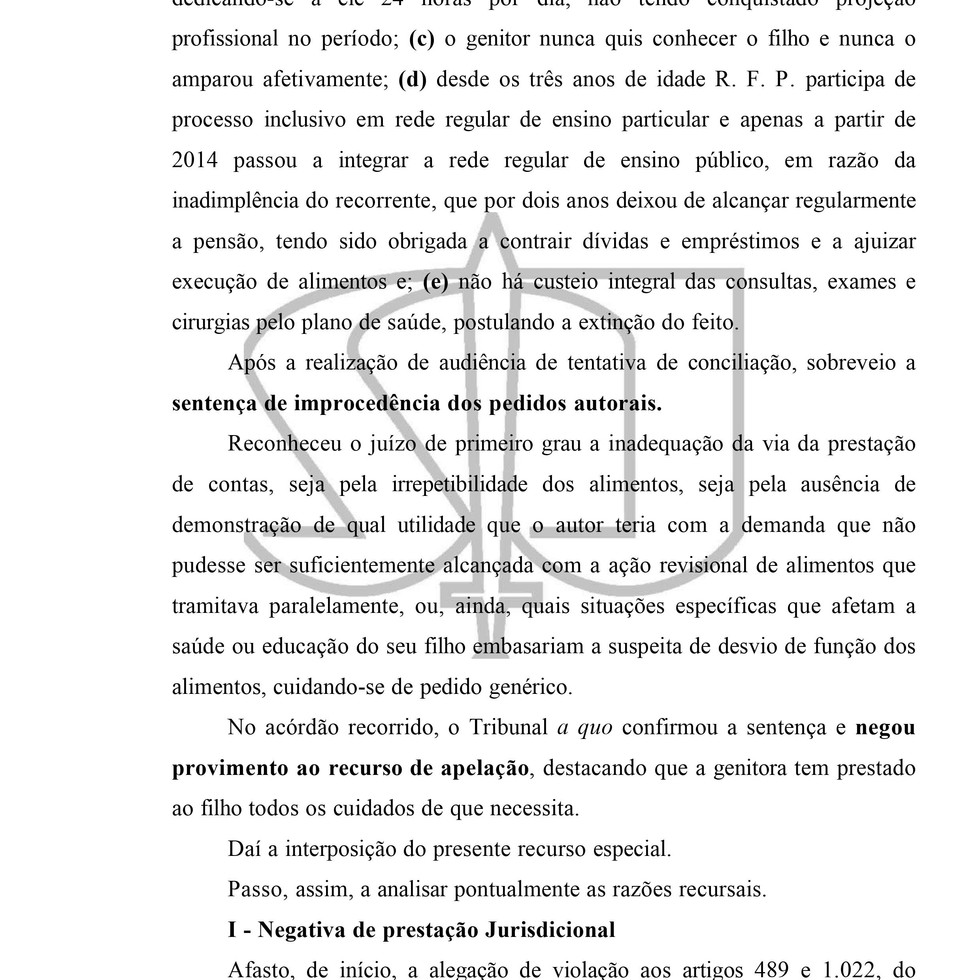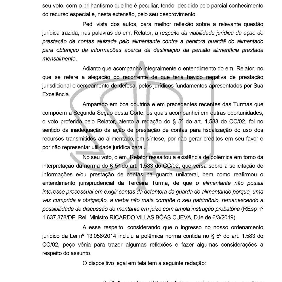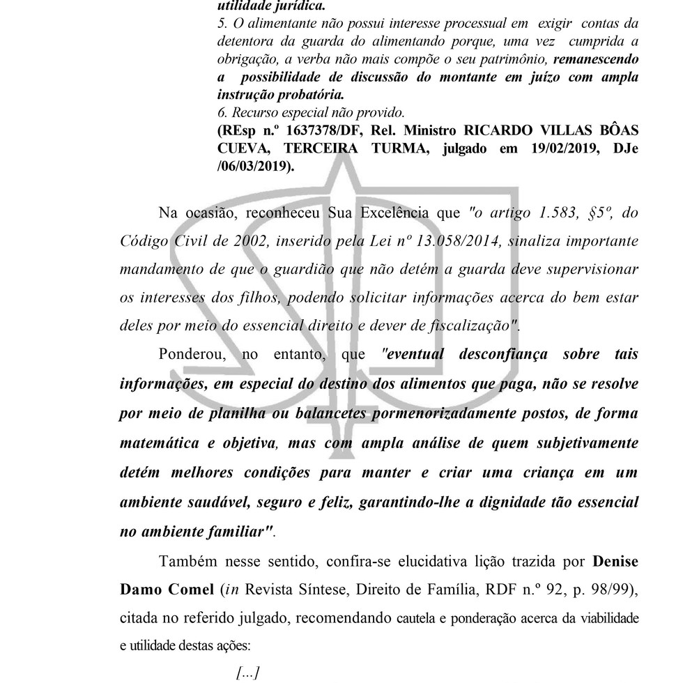 Não há apenas interesse jurídico, mas também o dever legal, por força do § 5º do art. 1.538 do CC/02, do genitor alimentante de acompanhar os gastos com o filho alimentado que não se encontra sob a sua guarda, fiscalizando o atendimento integral de suas necessidades materiais e imateriais essenciais ao seu desenvolvimento físico e também psicológico, aferindo o real destino do emprego da verba alimentar que paga mensalmente, pois ela é voltada para esse fim. 9.1. O que justifica o legítimo interesse processual em ação dessa natureza é só e exclusivamente a finalidade protetiva da criança ou do adolescente beneficiário dos alimentos, diante da sua possível malversação, e não o eventual acertamento de contas, perseguições ou picuinhas com a(o) guardiã(ao), devendo ela ser dosada, ficando vedada a possibilidade de apuração de créditos ou preparação de revisional pois os alimentos são irrepetíveis.